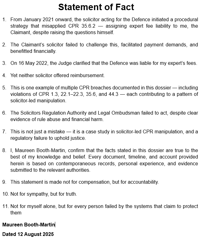 These violations are evidenced across Dossiers I–III and remain unaddressed by both the Solicitors Regulation Authority (SRA) and Legal Ombudsman (LO), despite clear regulatory obligations: