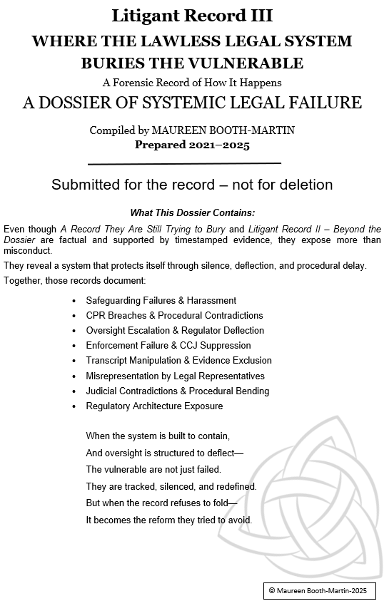 Whether acting as a Litigant in Person or as a formally represented client, I found myself in the same procedural swamp—one where solicitor misconduct was tolerated, regulatory oversight was absent, and procedural clarity was deliberately withheld. This record doesn’t just expose what happened. It documents how the system made it possible.