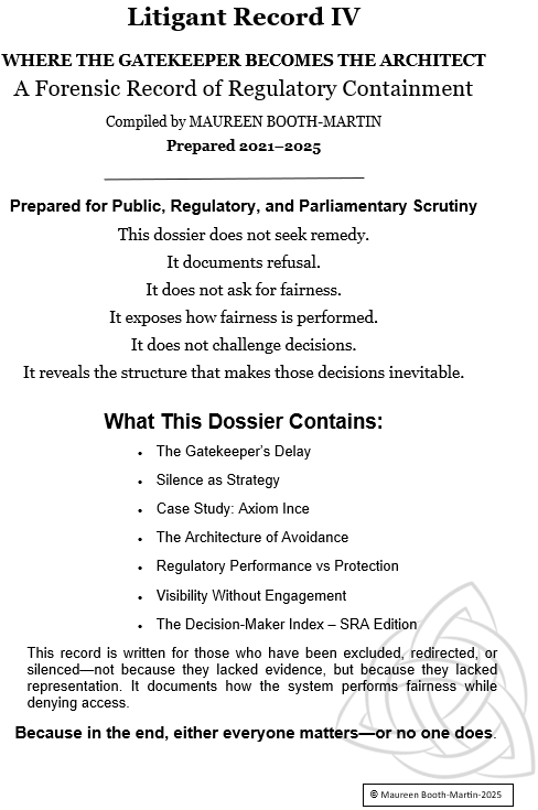 This capsule documents how the SRA performs oversight without engagement. It shows how acknowledgment becomes a placeholder, how silence becomes strategy, and how Litigants in Person are left exposed while firms reshape their narrative.